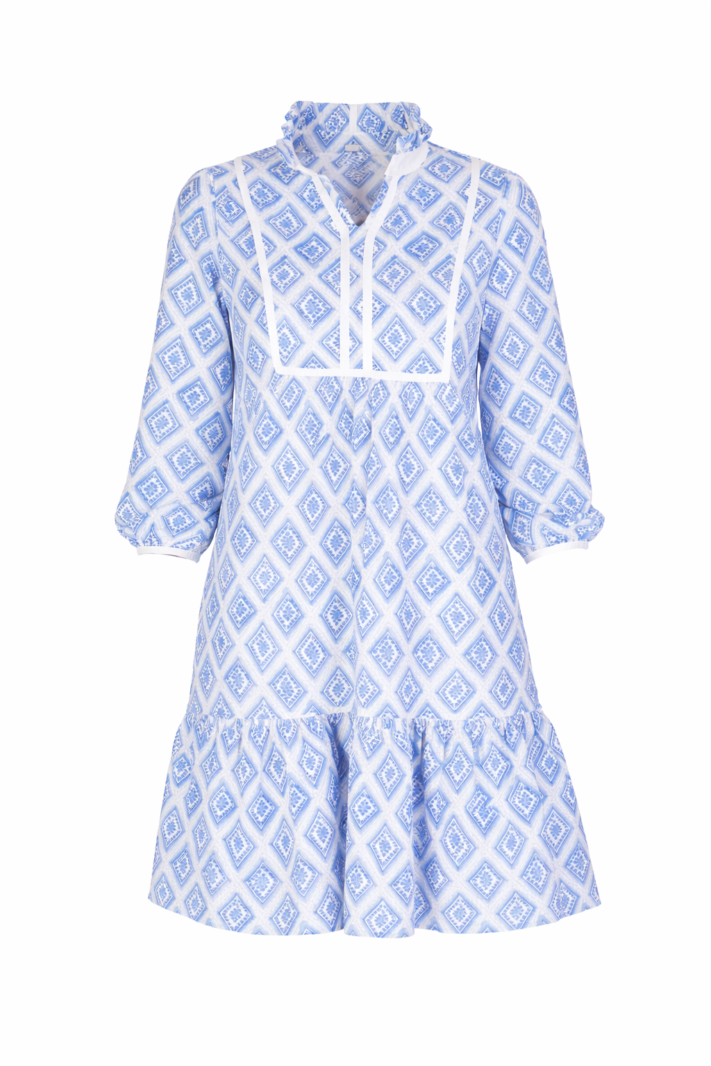 Thoughtful details elevate this coastal-inspired look, including a stand-up ruffled collar, contrast piping, and functional pockets for everyday ease.