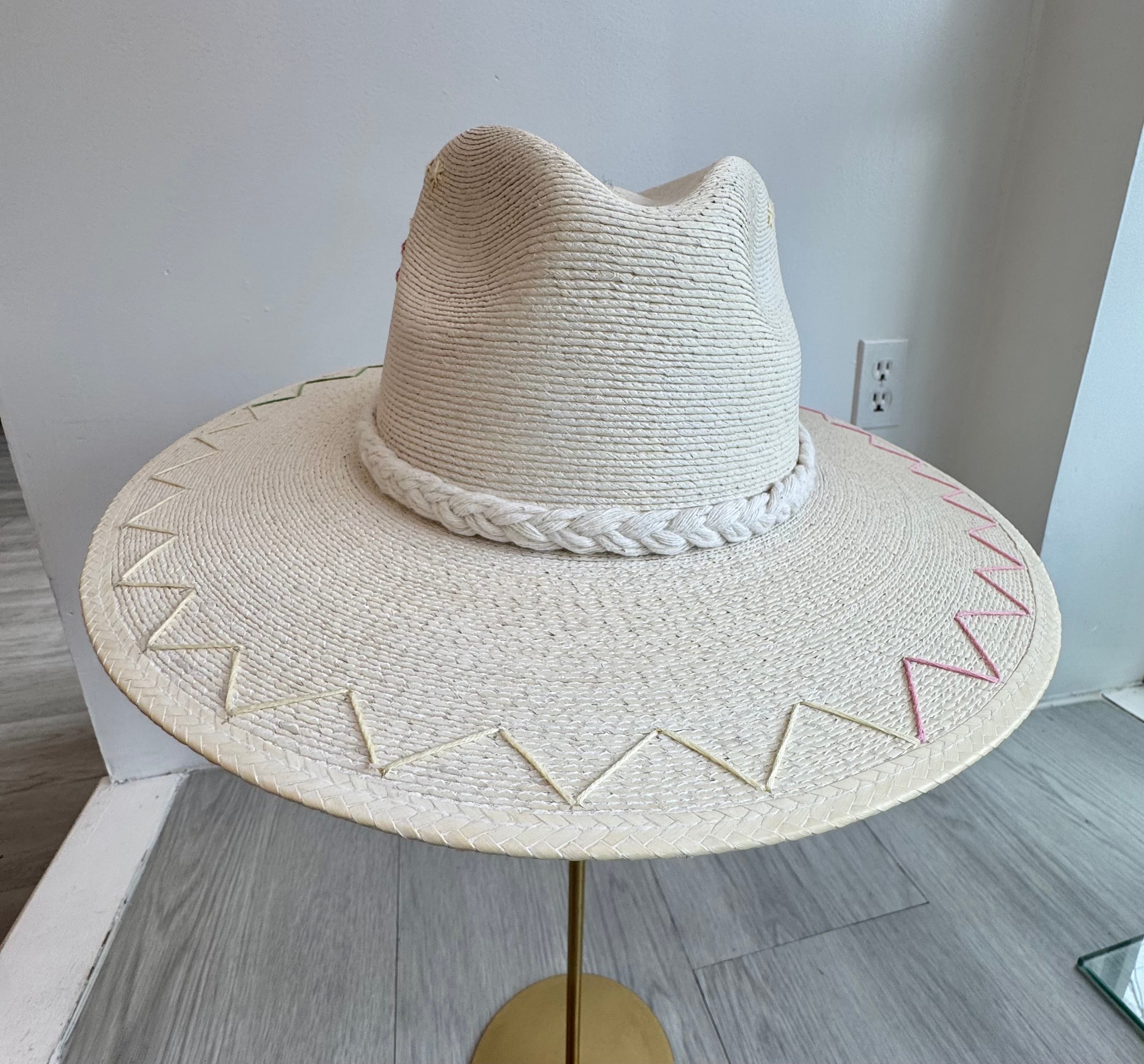 Handmade straw hat with embroidery leaves