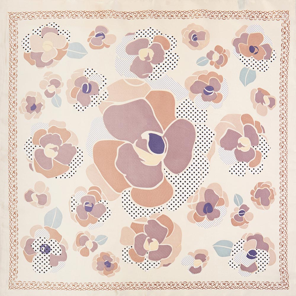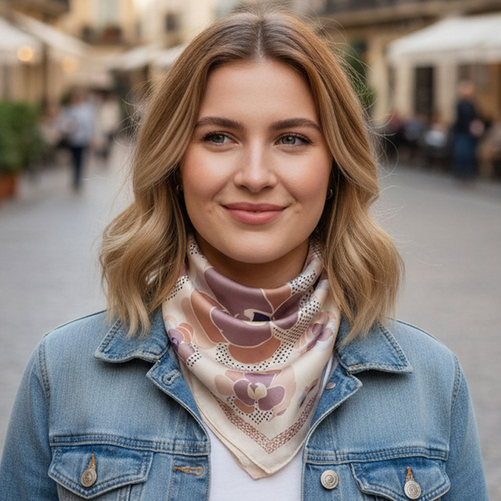 polyester scarf measures approx. 27.5" X 27.5". Wear either around your neck, your hair or handbag handle