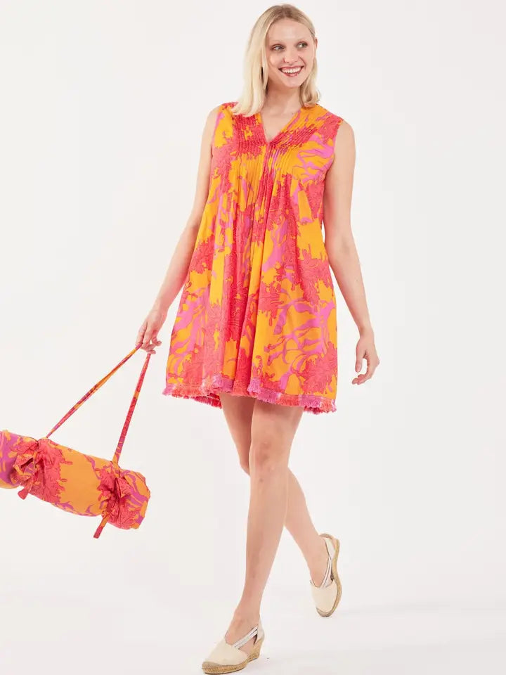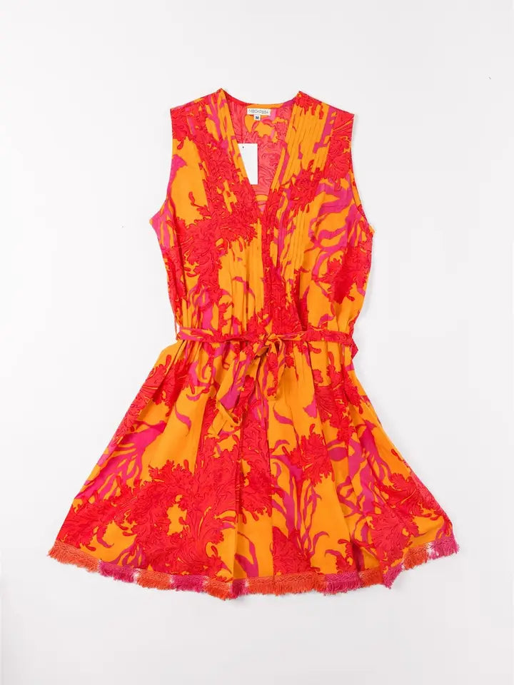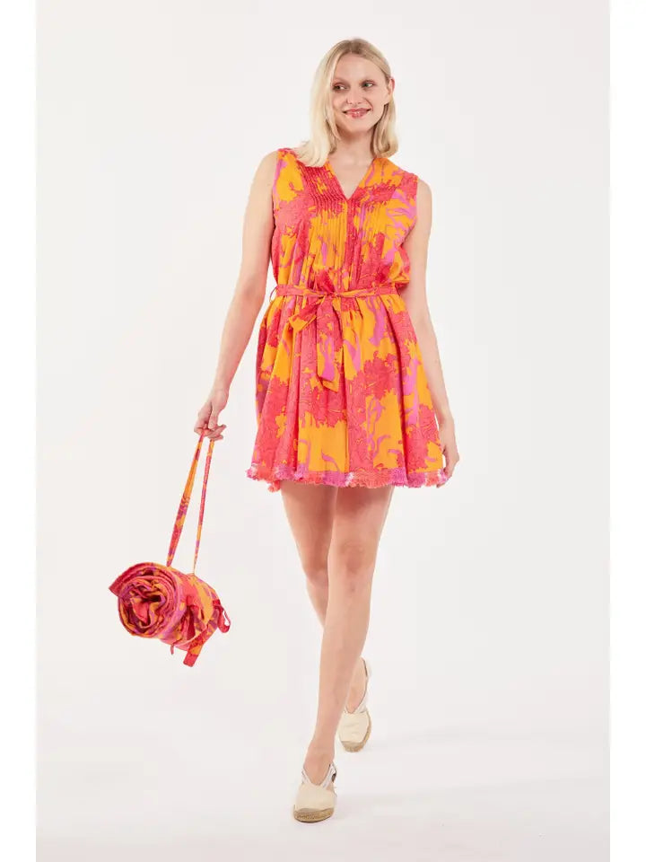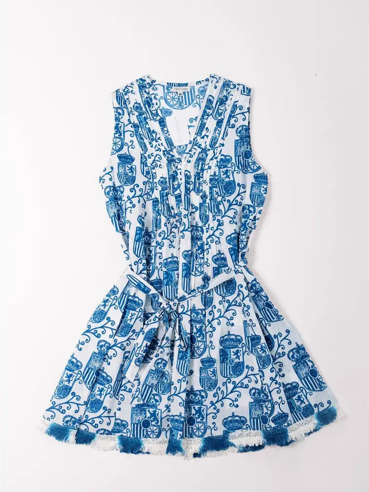 Turn heads and have fun with the Felice dress! Perfect for warm weather, this regal blue and white motif print dress features ombre dyed fringe trim and a detachable belt for a versatile look. With pintuck detailing, you'll feel effortlessly stylish and ready for any occasion!