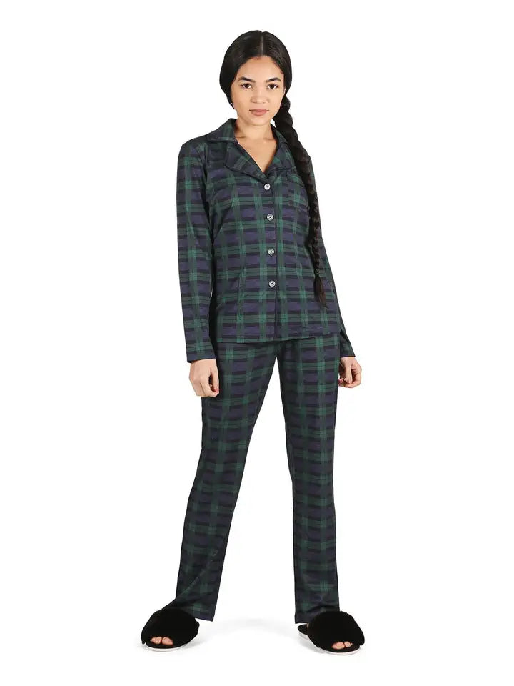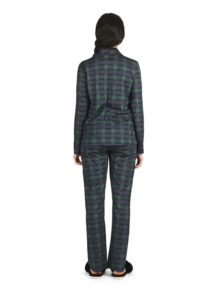Cuddle up at night with this 2-piece Plaid Notch Collar Cotton Blend PJ Set. This set includes a button-down long-sleeve shirt and pants, both made from a soft cotton blend for extra comfort and breathability. The design features a cozy plaid pattern, perfect for snuggling up when it's chilly regardless of the season.